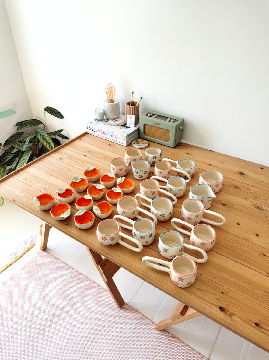 Each piece is designed with a focus on organic forms and feminine tones, which embrace the beauty of imperfections that comes with handmade ceramics. We make everything by hand, not on a wheel.